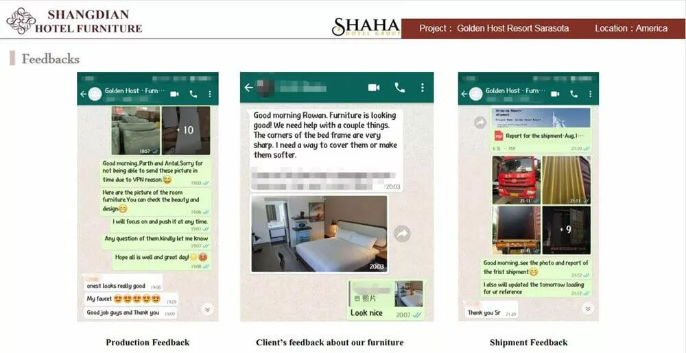 To get a good feedback was not easy, but Shangdian hotel furniture won a good feedback from Golden Host Hotel owner, who quite satisfied the hotel bedroom furniture we offered and aftersales customer service. Below picture is the feedback whatsapp message screenshots from them.